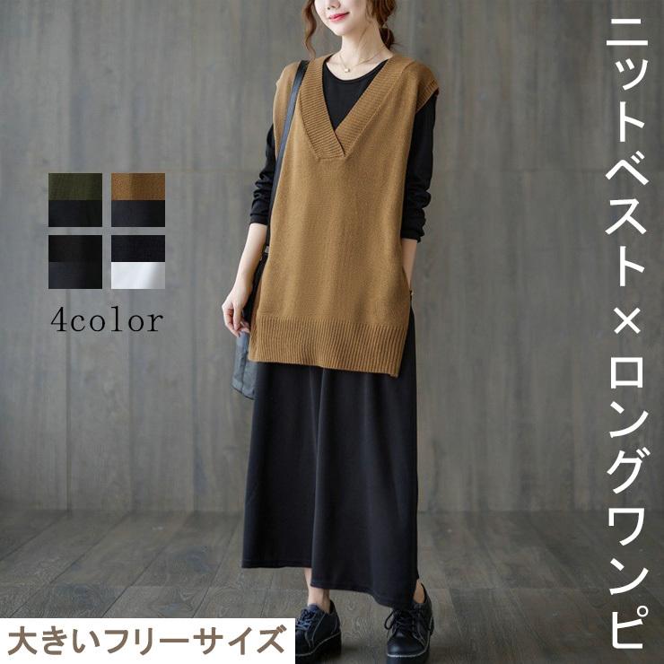 大きいサイズ レディース 重ね着ワンピース 長袖ワンピース ニットベスト マキシ丈 Ll 3l 4l ブラック ホワイト カーキ ブラウン 新入荷 ネコポス不可 Zy L 6lサイズの服 下着専門店queen 通販 Yahoo ショッピング